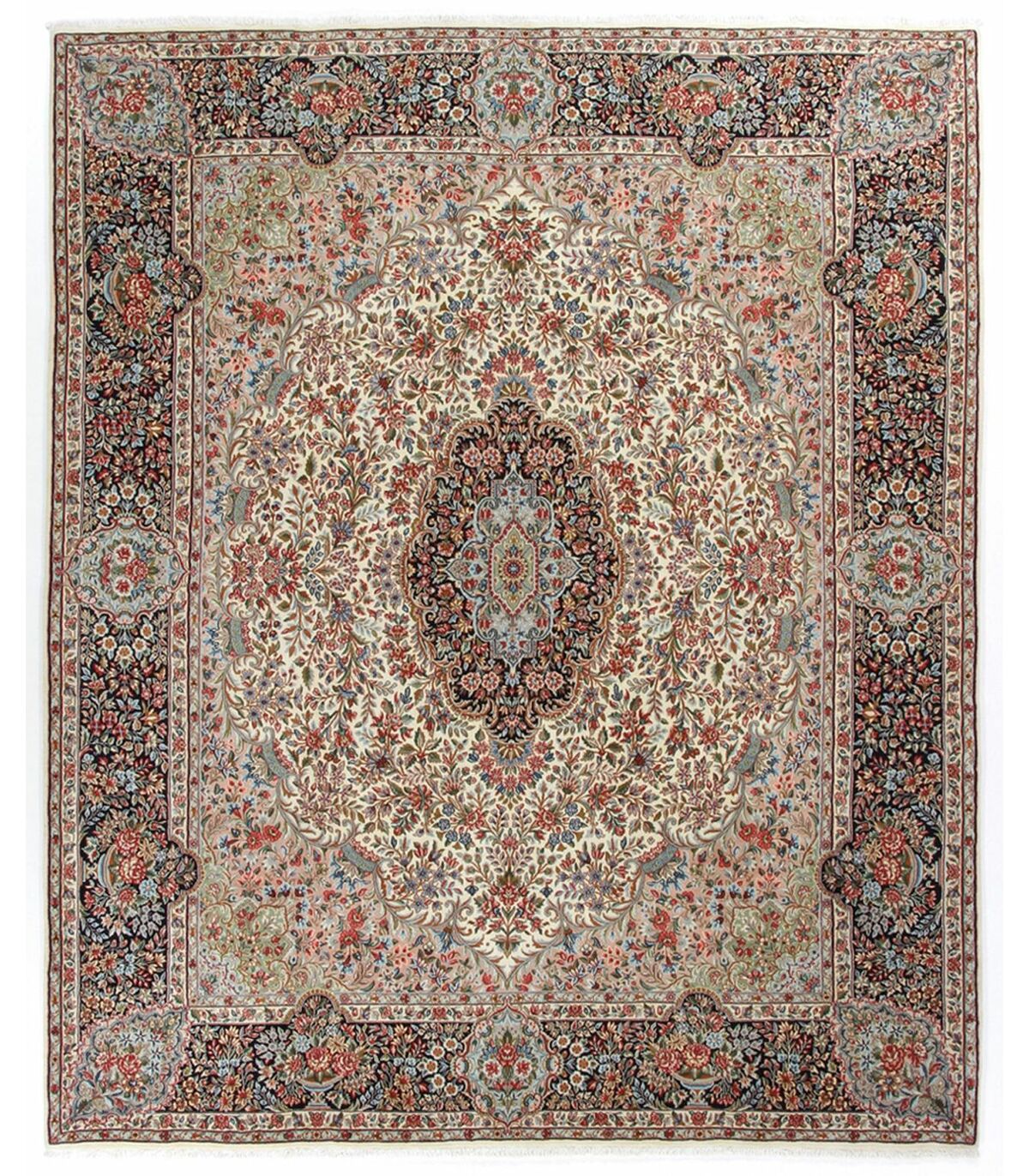 Kerman-Teppiche bestechen durch ihre filigrane Blütenornamentik. Bisweilen werden auch so genannte Spiegel-Kermans, d.h. ein freiflächiges Grundmuster mit einem Mittelstück geknüpft. Der Ort Kerman existiert bereits seit dem 4. Jahrhundert und ist berühmt für seine Teppiche.