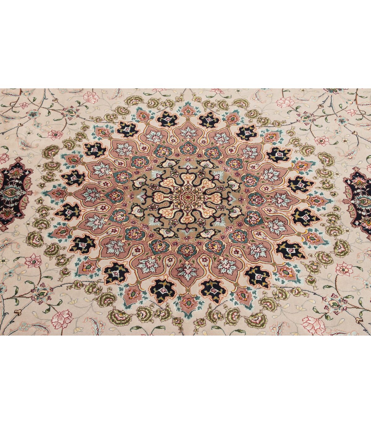 Tabriz-Teppiche haben eine lange Tradition. Aus dieser Provenienz kommen die meisten Muster und Güteklassen. Typisch für die Qualität der Tabriz-Teppiche ist die Verwendung eines sehr feinen Garns und eine gleichmäßige und sehr akurate Knüpfung mit türkischem Knoten. Radj ist die Maßeinheit der Qualitätsstufen aller Tabriz-Teppiche. Sie gibt die Anzahl der Knoten auf einer Breite von 7 cm an. So steht z.B. 50radj für 50 Knoten auf einer Länge von ca. 7 cm. Da es eine altertümliche Maßeinheit ist, die sich innerhalb der Regionen unterscheidet, sind leichte Abweichungen von ca. 10 Prozent üblich. Florale Grundmuster sind die dominierenden Muster - in vielfältigen Mustergattungen und Farbgebungen.
